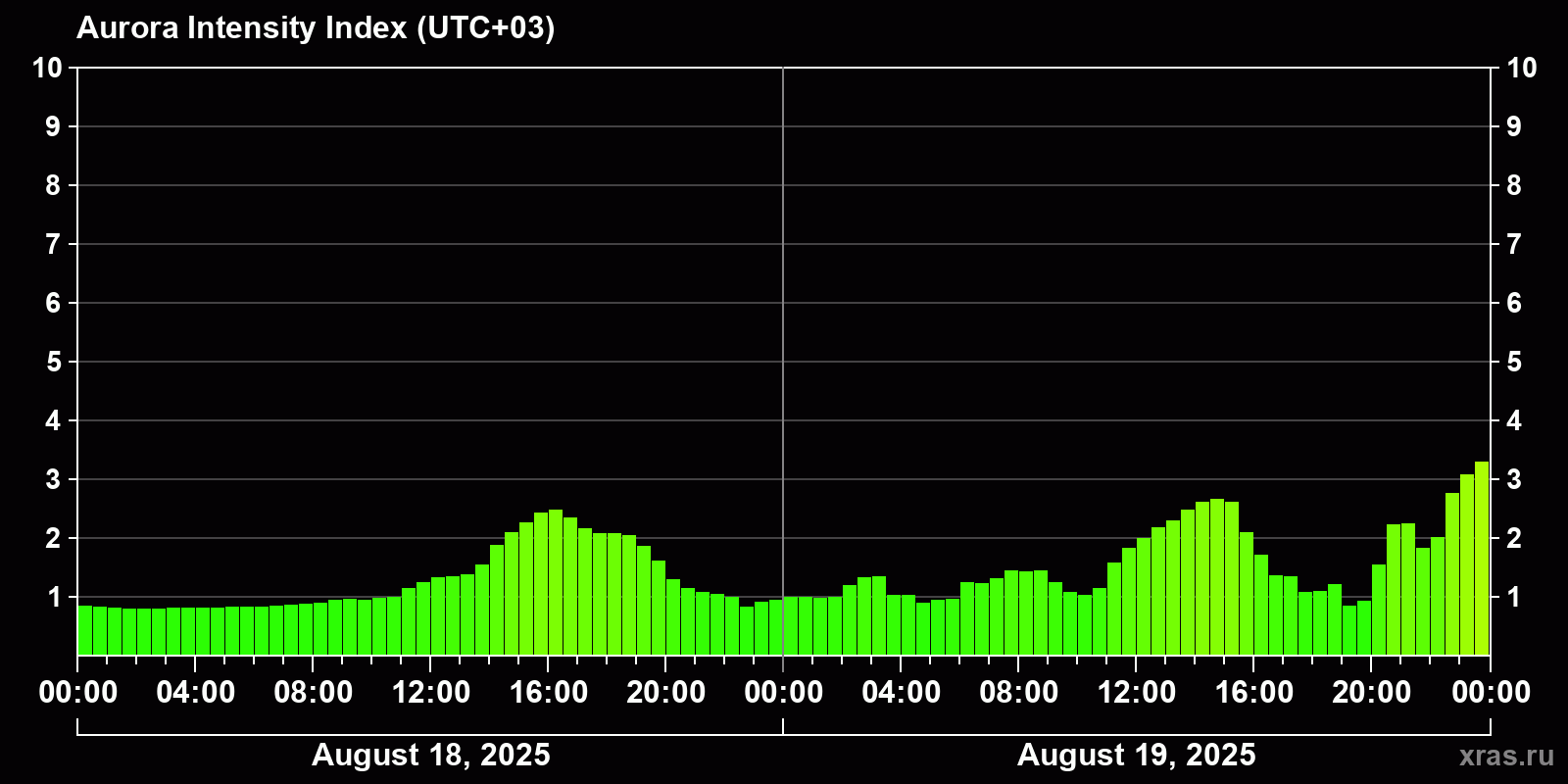 Auroral intensity index and the theoretically possible latitude of observations for nighttime in the Estern Hemisphere as of 2025-08-19 23:46 (end of day) local time