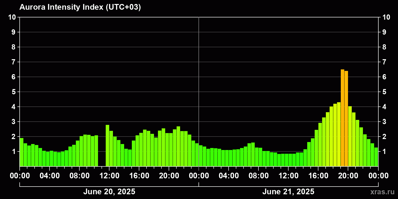 Auroral intensity index and the theoretically possible latitude of observations for nighttime in the Estern Hemisphere as of 2025-06-21 23:48 (end of day) local time