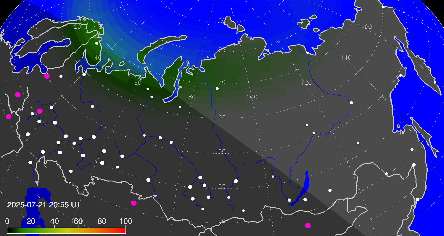 Probability of northern lights (auroras) in cities of Russia