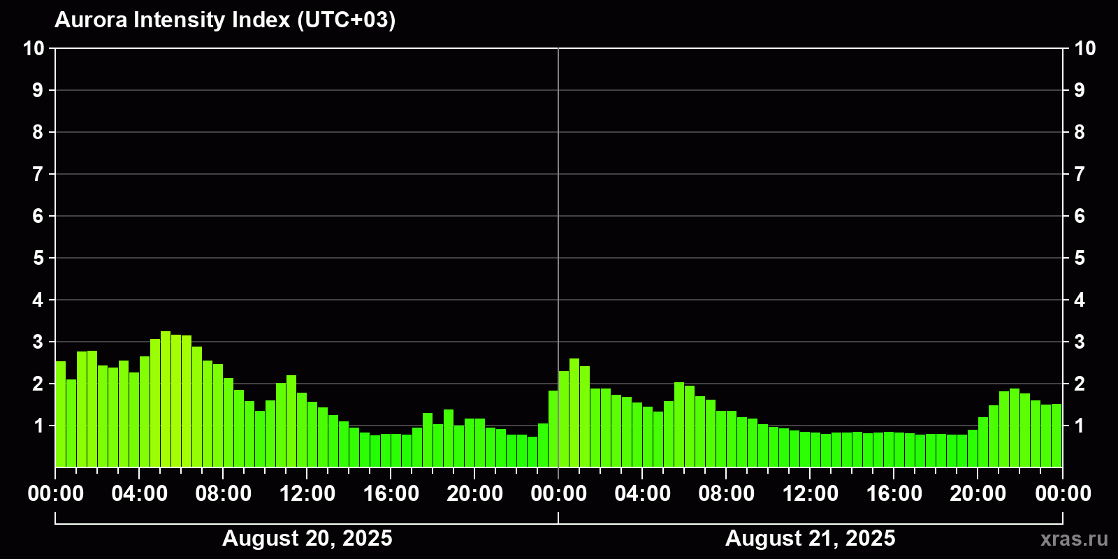 Auroral intensity index and the theoretically possible latitude of observations for nighttime in the Estern Hemisphere as of 2025-08-21 23:46 (end of day) local time