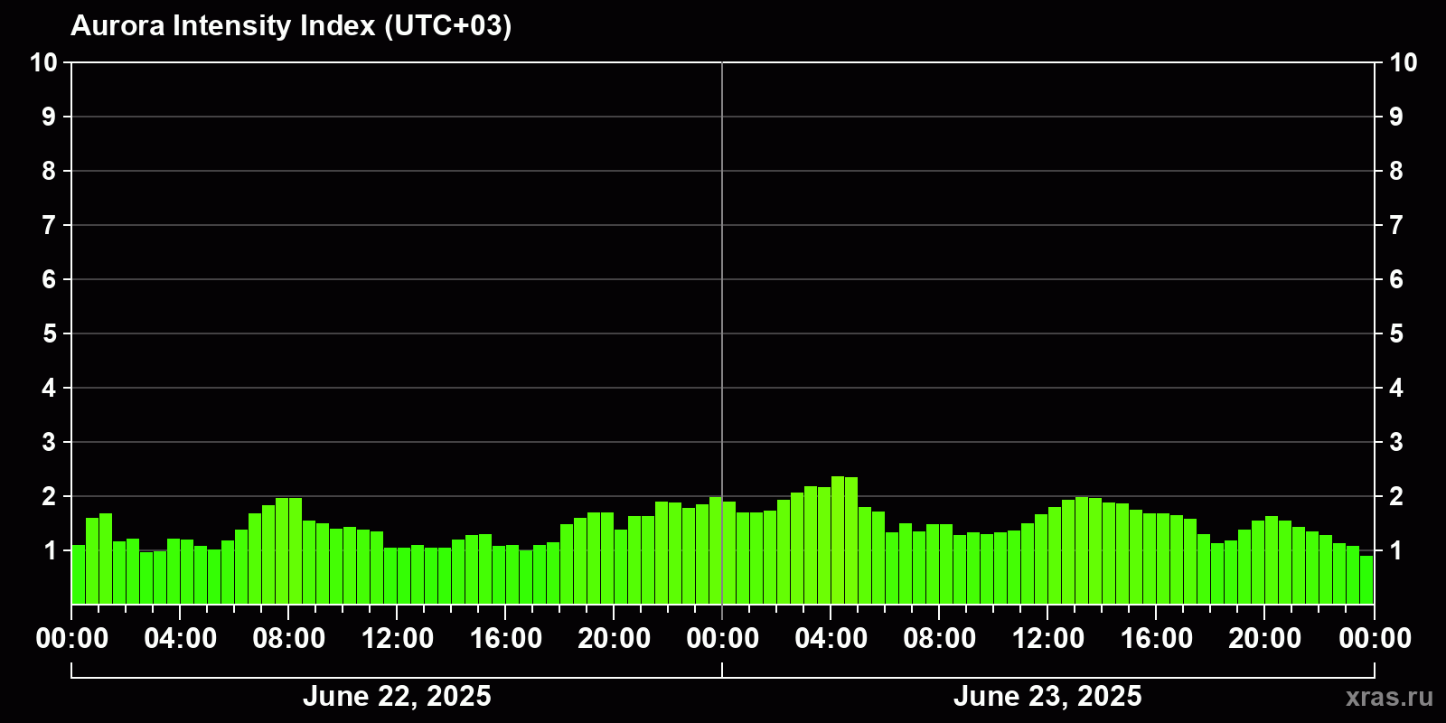 Auroral intensity index and the theoretically possible latitude of observations for nighttime in the Estern Hemisphere as of 2025-06-23 23:58 (end of day) local time