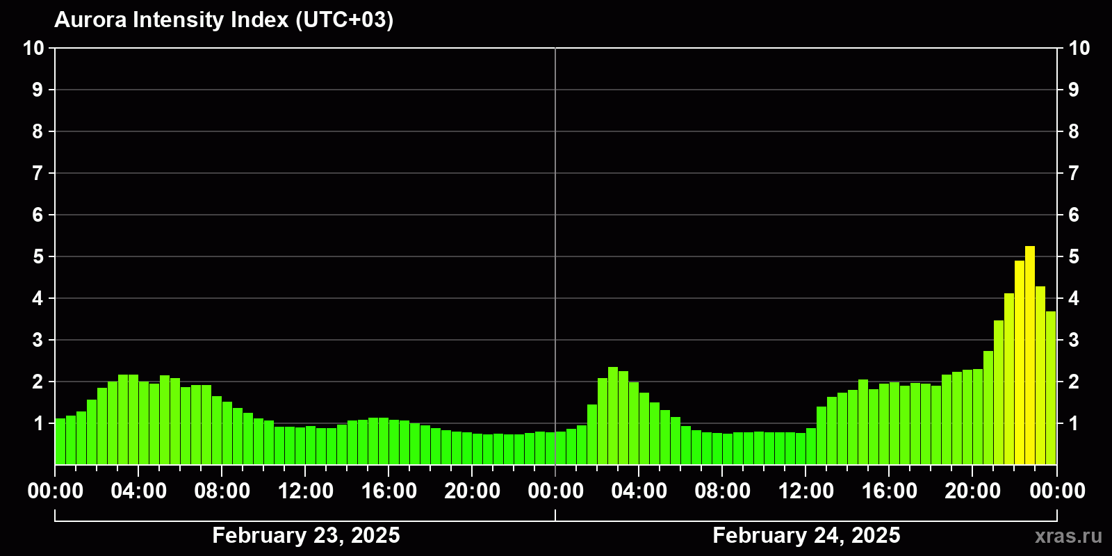 Auroral intensity index and the theoretically possible latitude of observations for nighttime in the Estern Hemisphere as of 2025-02-24 23:57 (end of day) local time