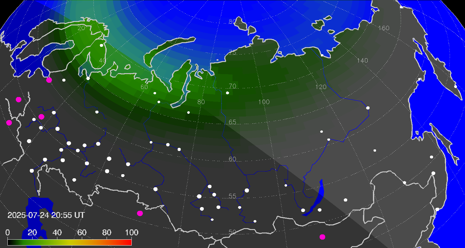 Probability of northern lights (auroras) in cities of Russia