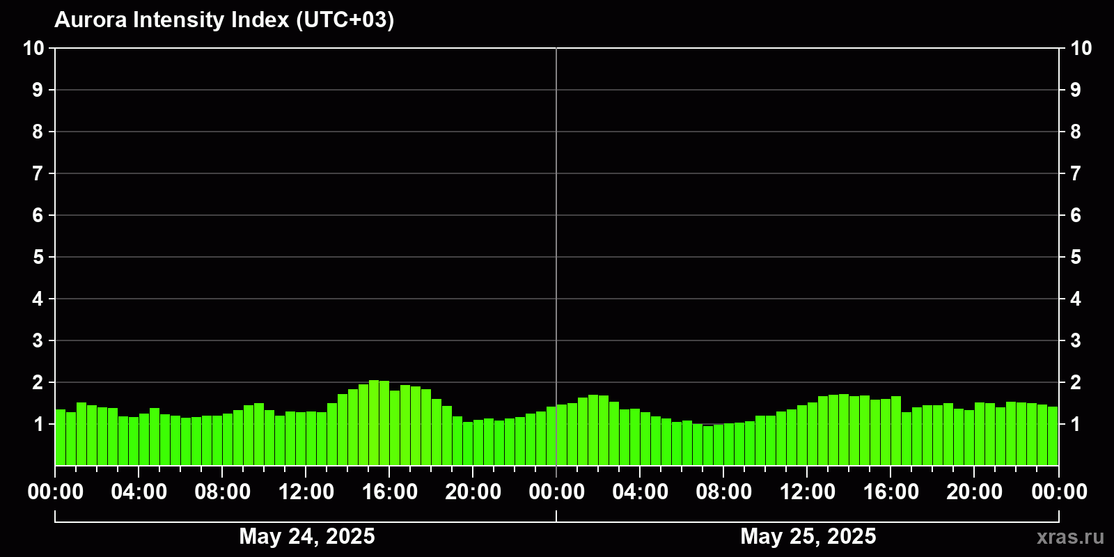 Changes in the auroral intensity index from 2025-05-24 to 2025-05-25 local time