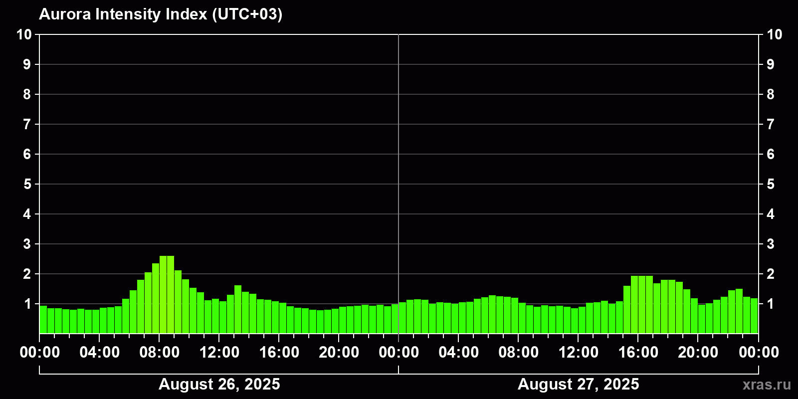 Auroral intensity index and the theoretically possible latitude of observations for nighttime in the Estern Hemisphere as of 2025-08-27 23:47 (end of day) local time