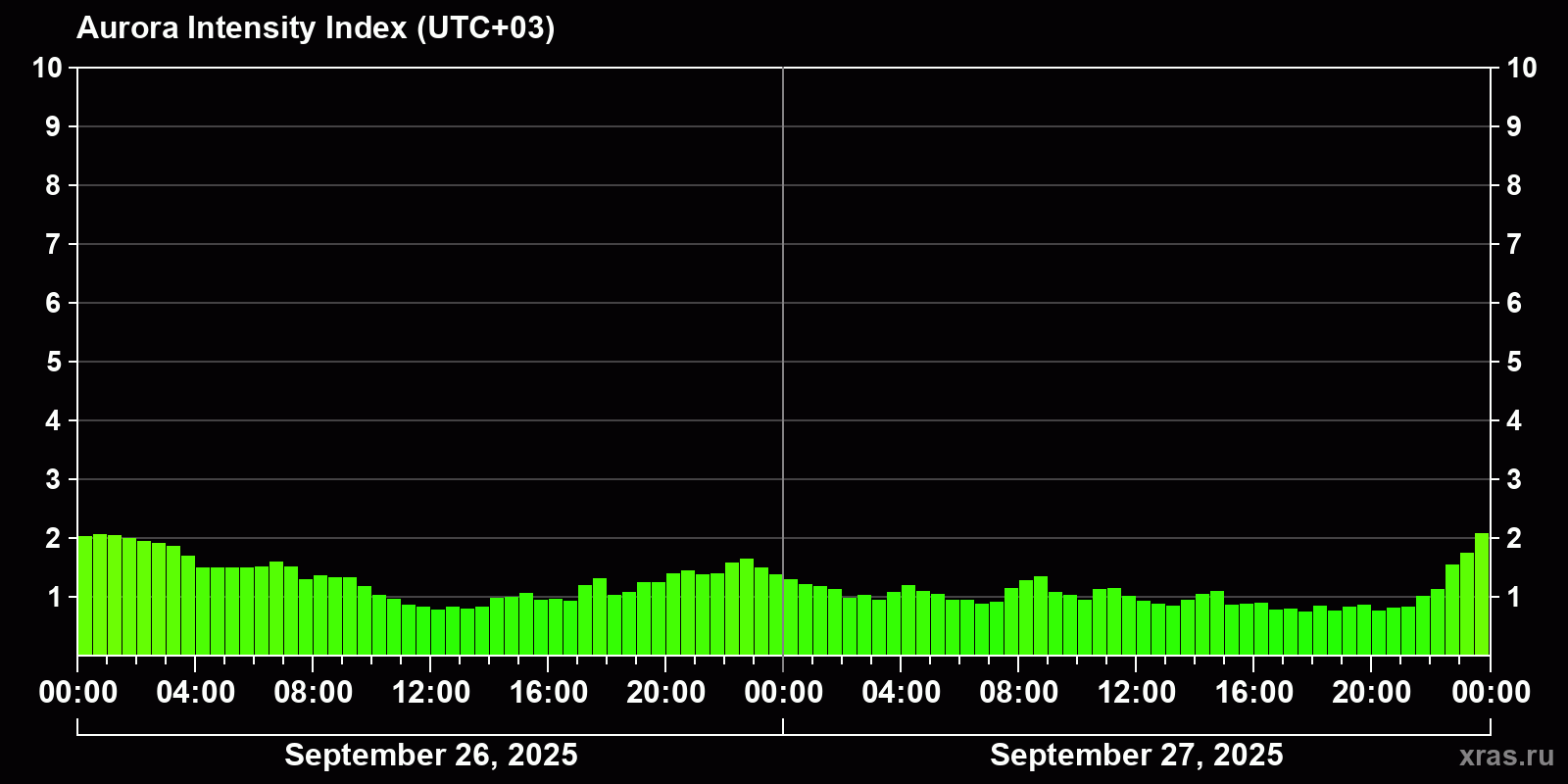 Changes in the auroral intensity index from 2025-09-26 to 2025-09-27 local time