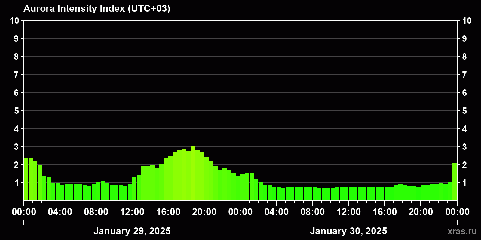 Auroral intensity index and the theoretically possible latitude of observations for nighttime in the Estern Hemisphere as of 2025-01-30 23:57 (end of day) local time