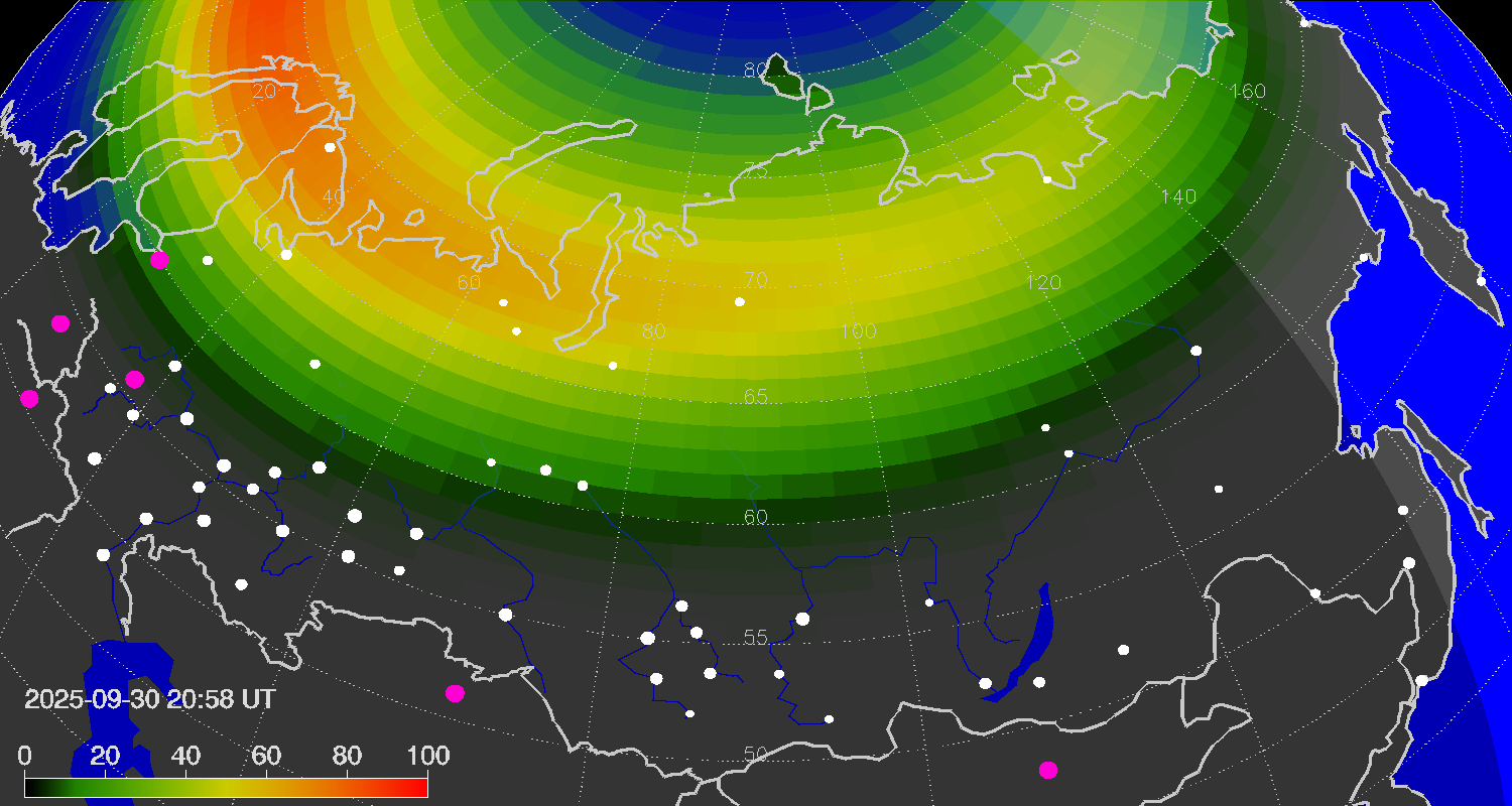 Probability of northern lights (auroras) in cities of Russia