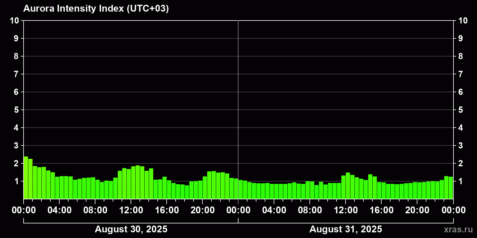 Auroral intensity index and the theoretically possible latitude of observations for nighttime in the Estern Hemisphere as of 2025-08-31 23:57 (end of day) local time