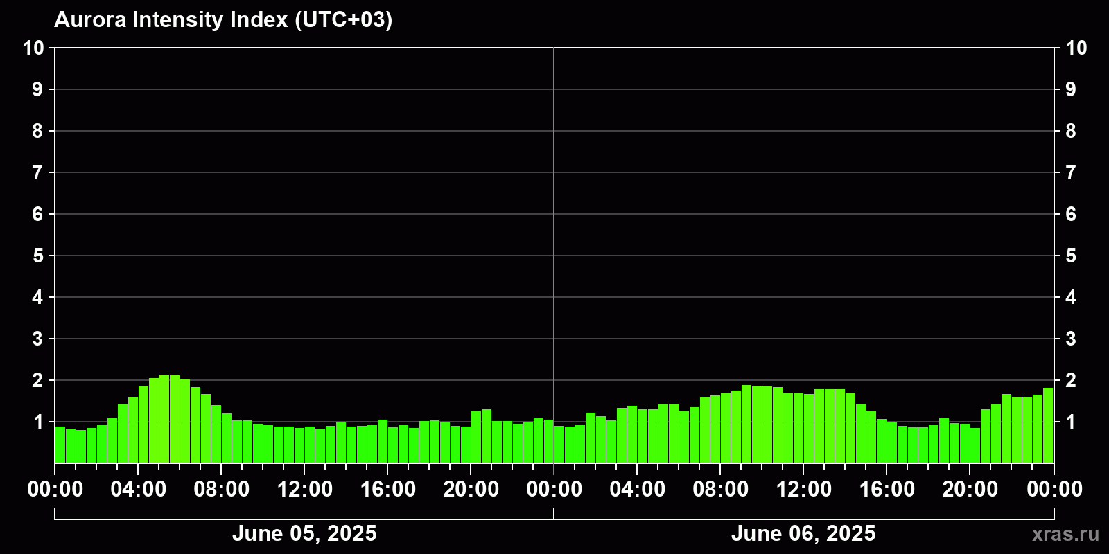 Auroral intensity index and the theoretically possible latitude of observations for nighttime in the Estern Hemisphere as of 2025-06-06 23:56 (end of day) local time