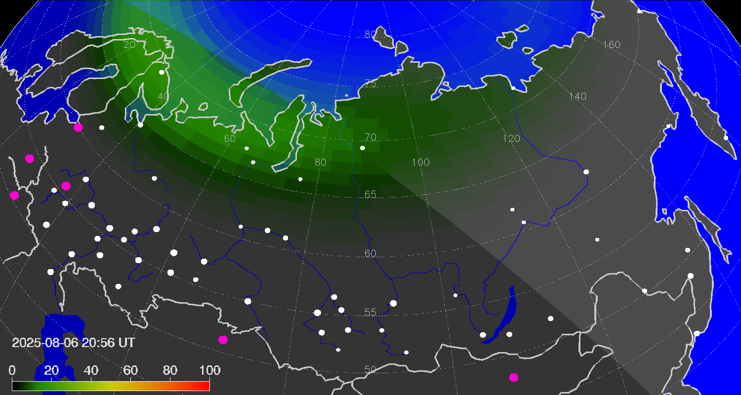 Probability of northern lights (auroras) in cities of Russia