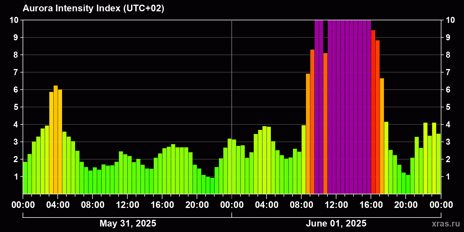 Changes in the auroral intensity index from 2025-05-31 to 2025-06-01 local time