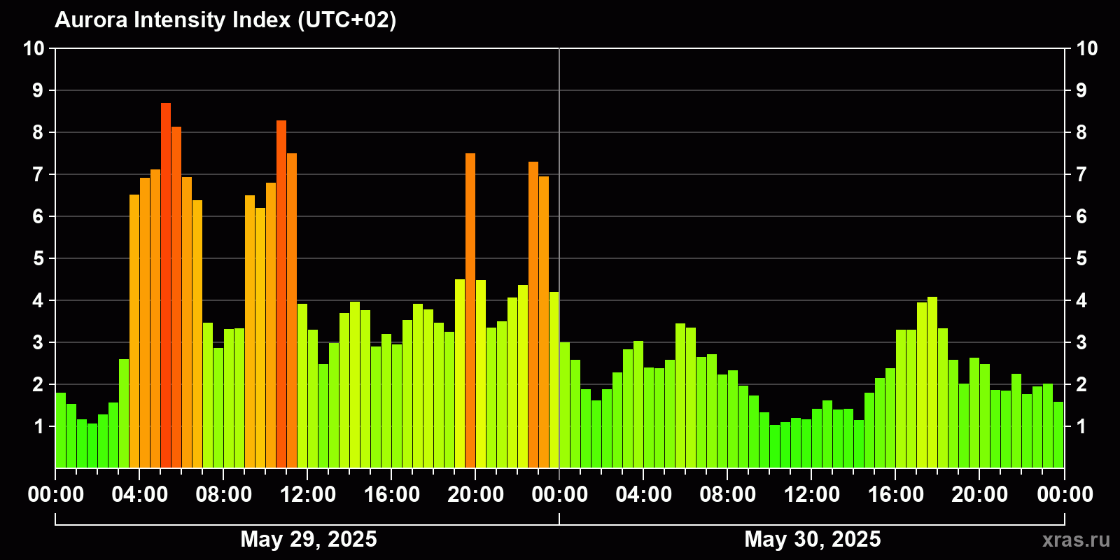 Changes in the auroral intensity index from 2025-05-29 to 2025-05-30 local time