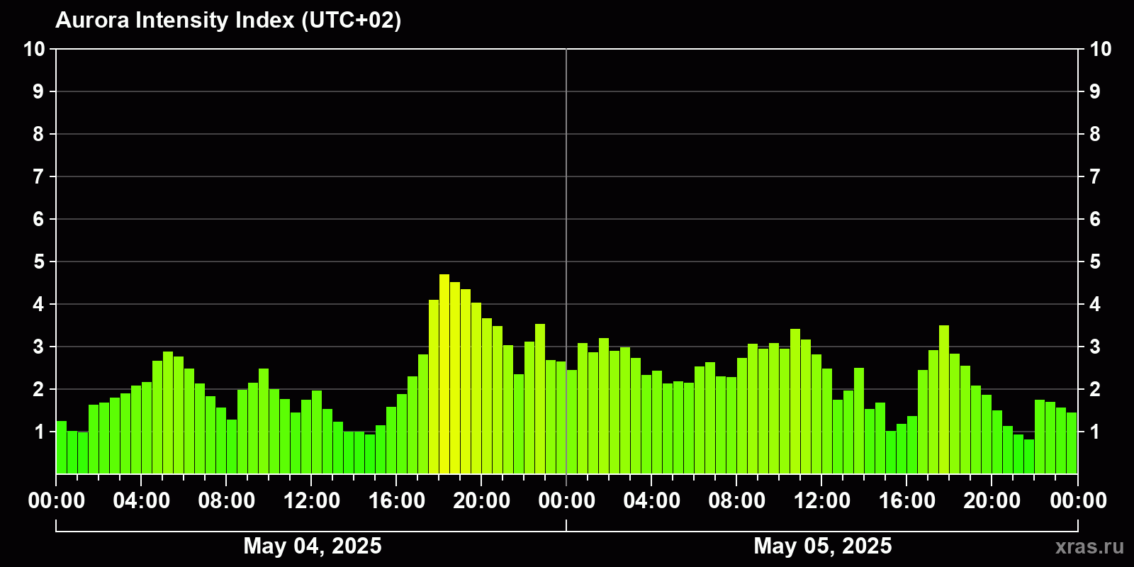 Auroral intensity index and the theoretically possible latitude of observations for nighttime in the Estern Hemisphere as of 2025-05-05 23:47 (end of day) local time