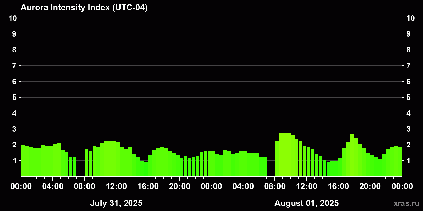 Auroral intensity index and the theoretically possible latitude of observations for nighttime in the Western Hemisphere as of 2025-08-01 23:50 (end of day) local time