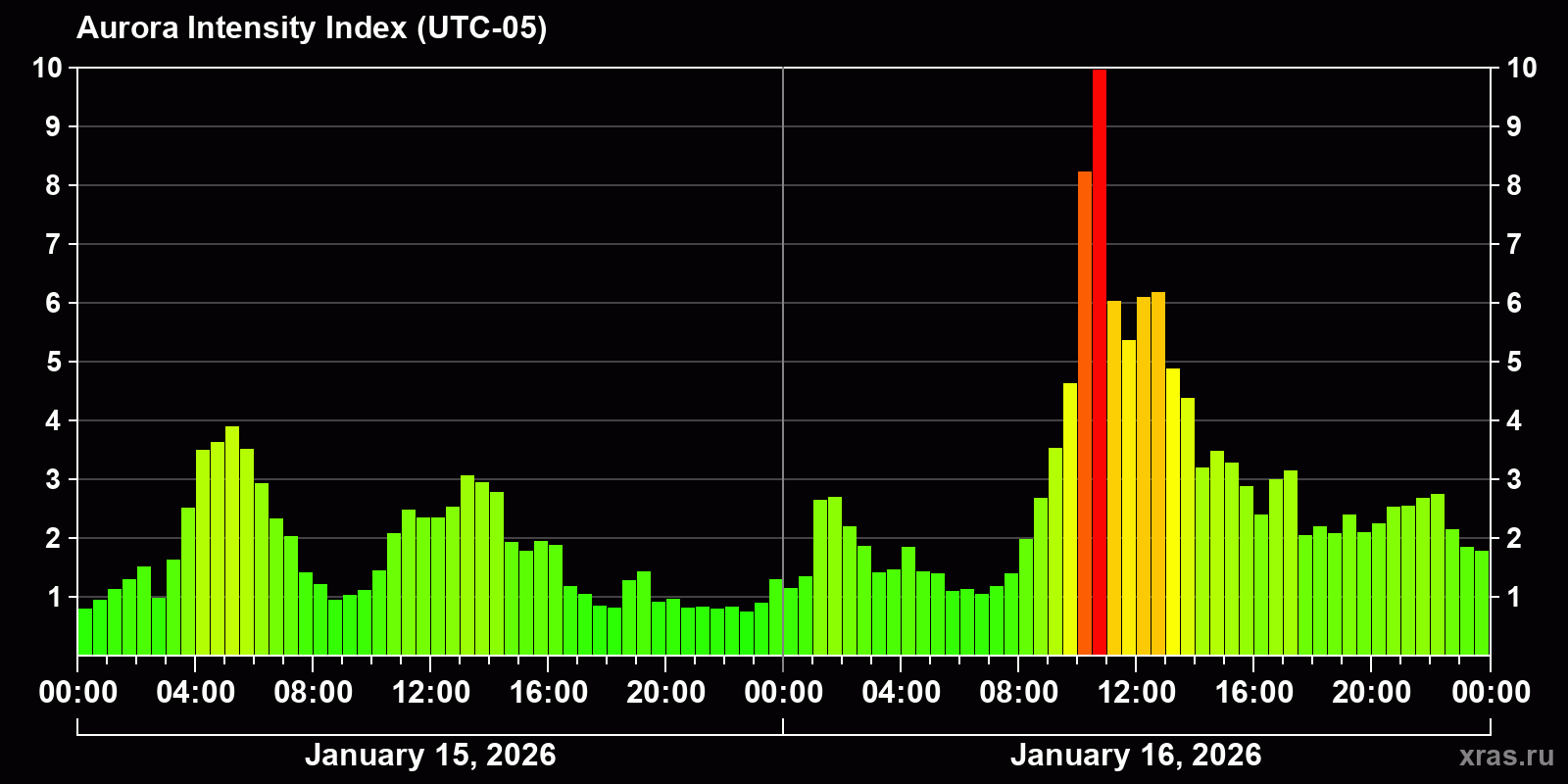 Auroral intensity index and the theoretically possible latitude of observations for nighttime in the Western Hemisphere as of 2026-01-16 23:56 (end of day) local time