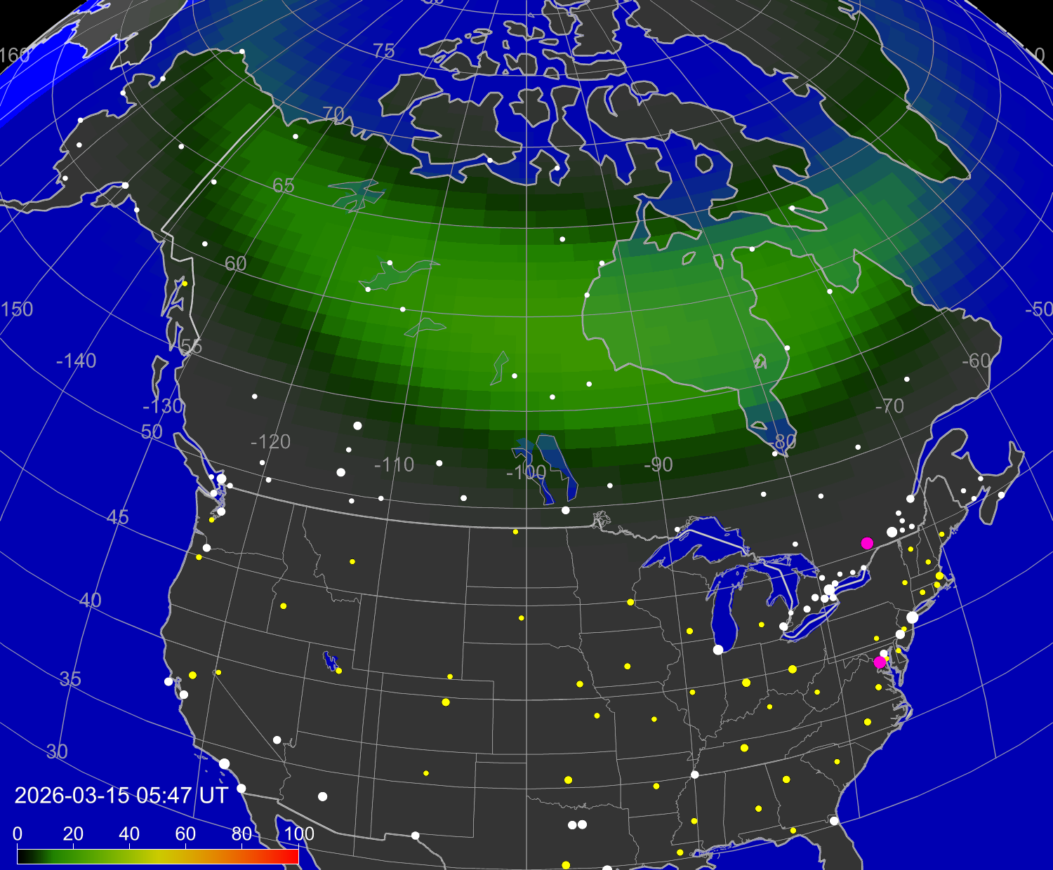 Изменения и часовой прогноз индекса интенсивности полярных сияний с 2026-03-14 по 2026-03-15