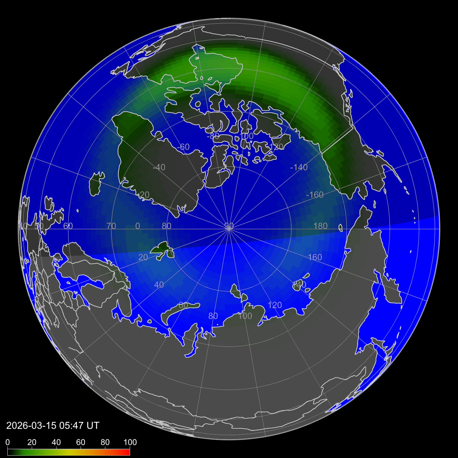 Индекс интенсивности полярных сияний и теоретически возможная широта наблюдений для ночного времени в западном полушарии