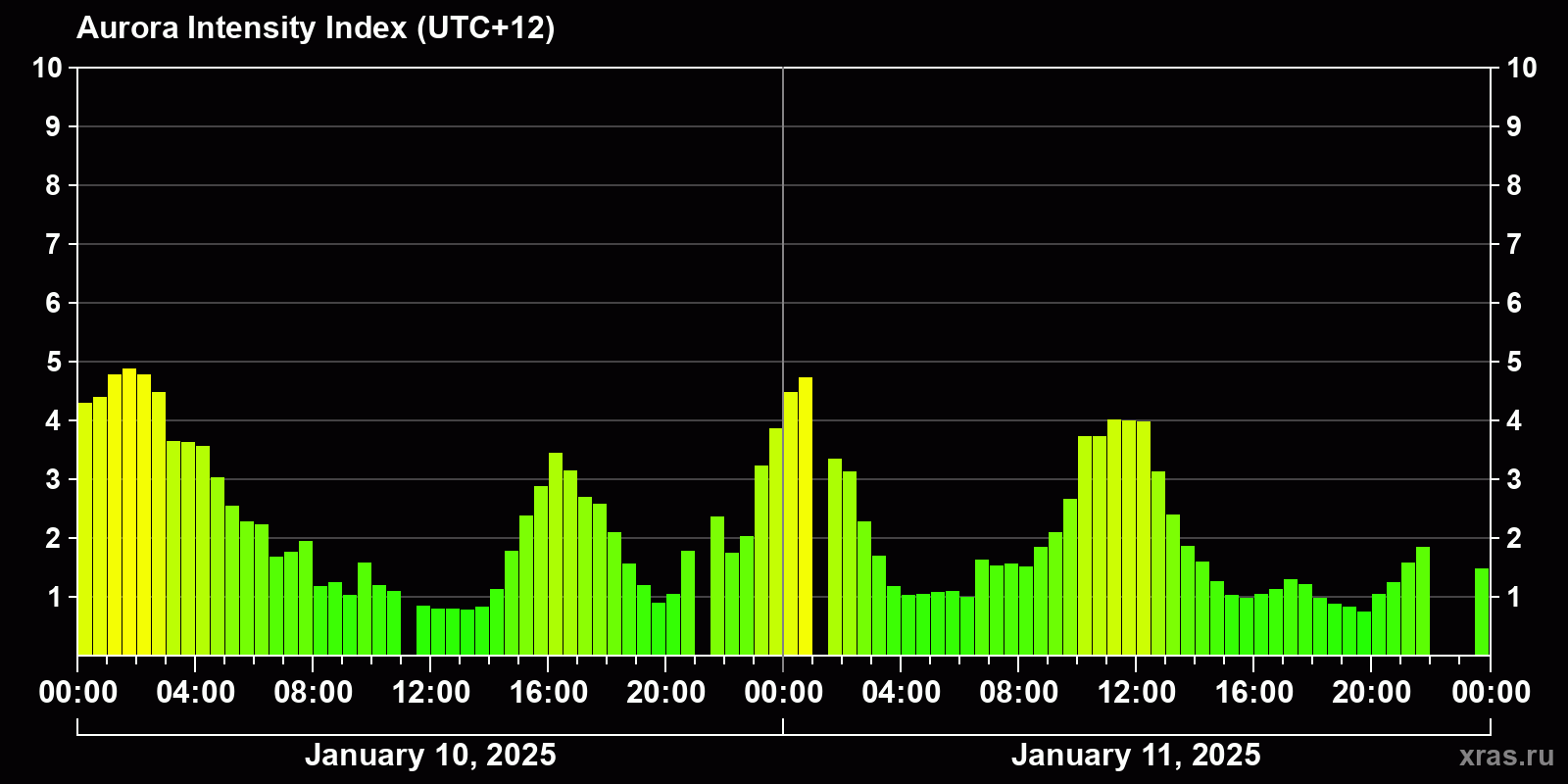 Changes in the auroral intensity index from 2025-01-10 to 2025-01-11 local time