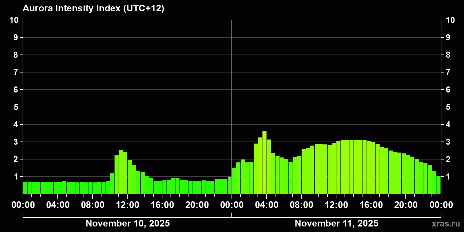 Changes in the auroral intensity index from 2025-11-10 to 2025-11-11 local time
