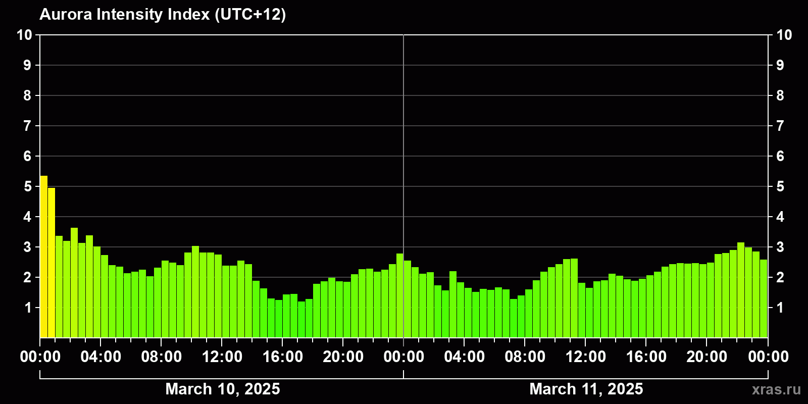 Changes in the auroral intensity index from 2025-03-10 to 2025-03-11 local time