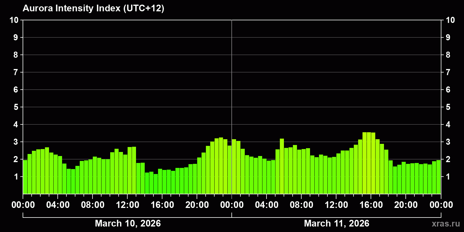 Changes in the auroral intensity index from 2026-03-10 to 2026-03-11 local time
