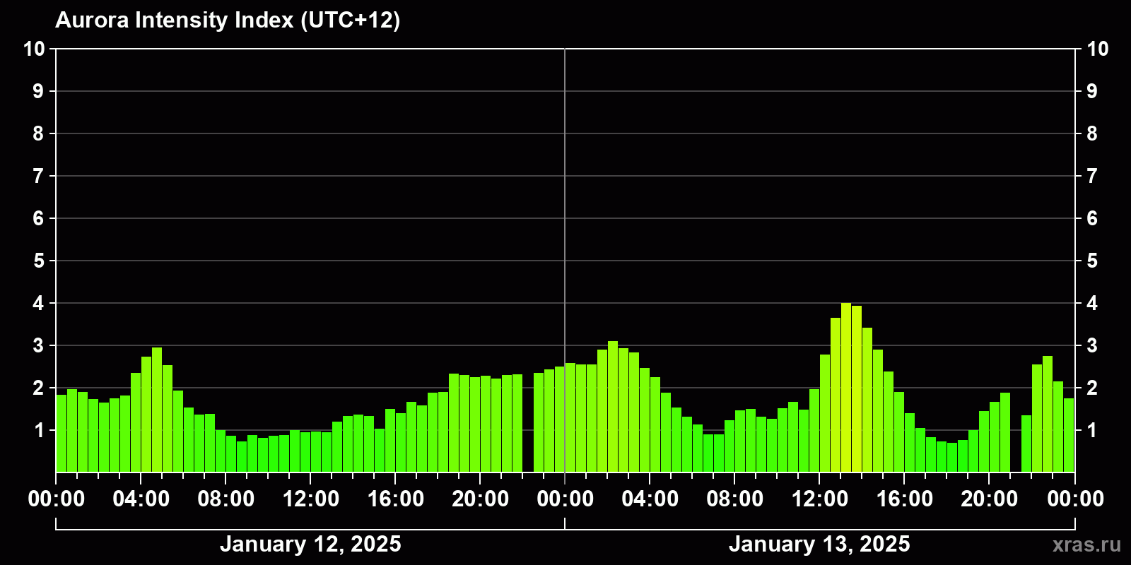 Changes in the auroral intensity index from 2025-01-12 to 2025-01-13 local time
