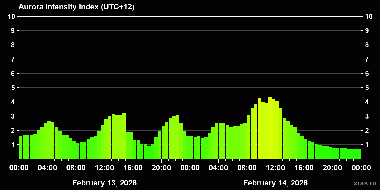 Changes in the auroral intensity index from 2026-02-13 to 2026-02-14 local time