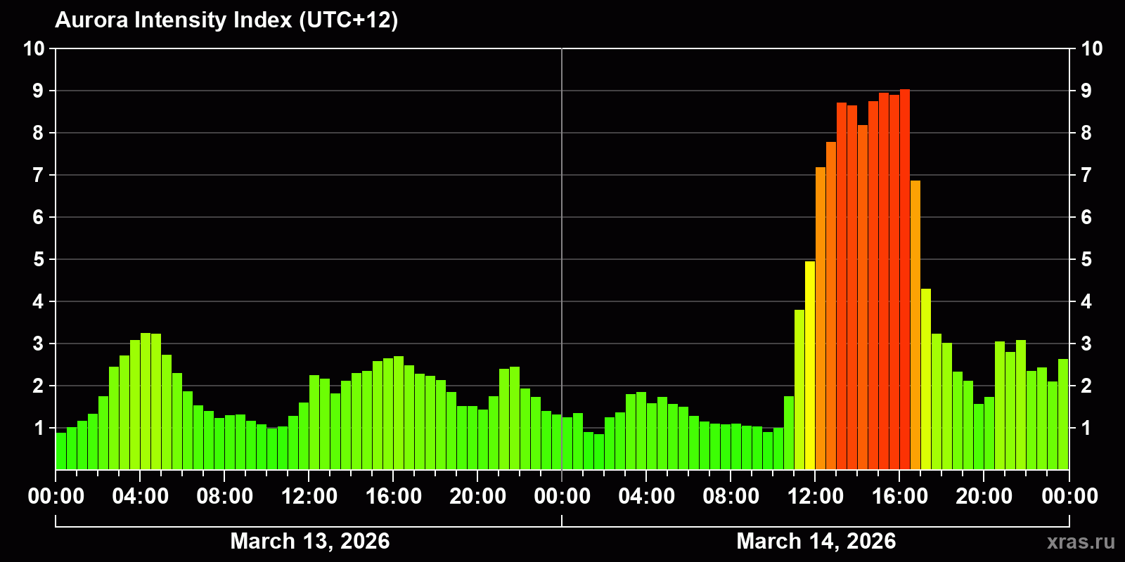 Changes in the auroral intensity index from 2026-03-13 to 2026-03-14 local time