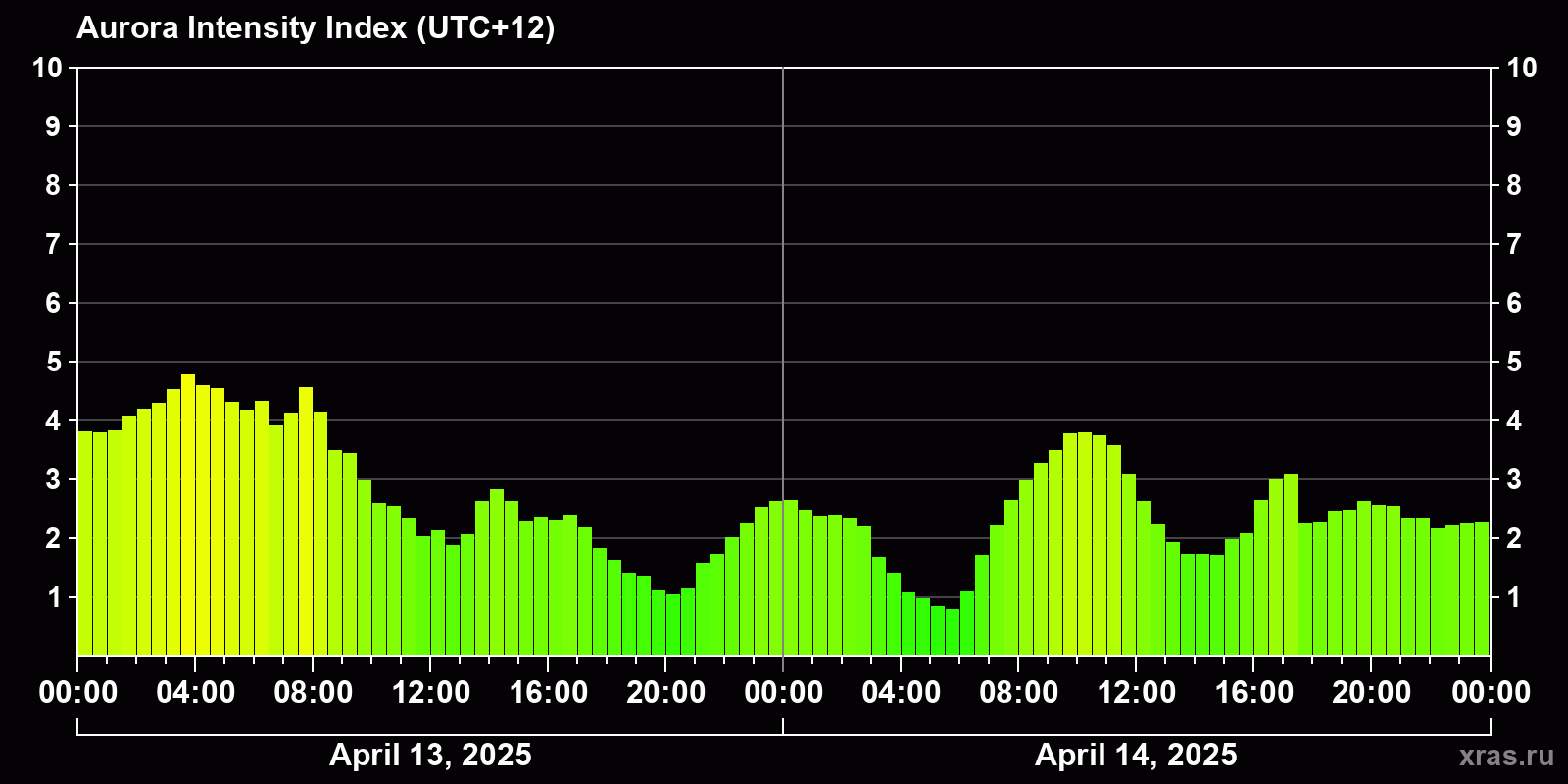 Changes in the auroral intensity index from 2025-04-13 to 2025-04-14 local time
