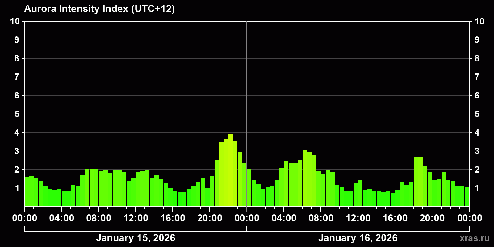 Changes in the auroral intensity index from 2026-01-15 to 2026-01-16 local time