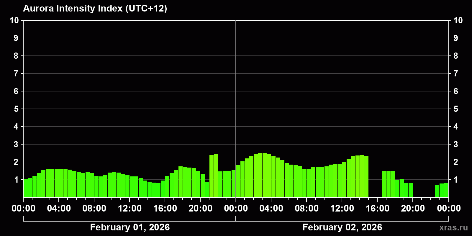 Changes in the auroral intensity index from 2026-02-01 to 2026-02-02 local time