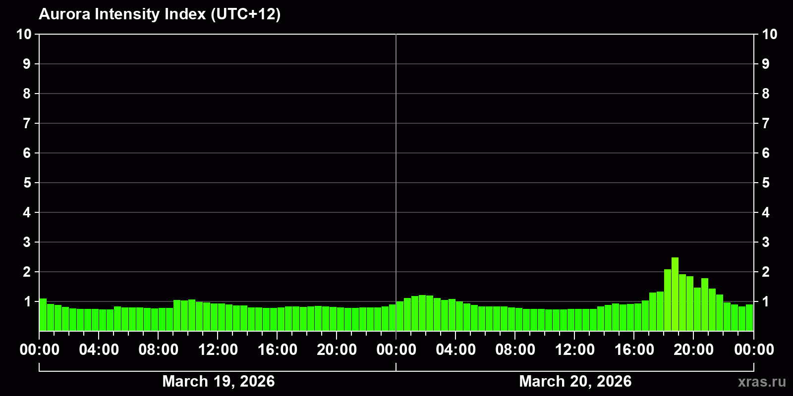 Changes in the auroral intensity index from 2026-03-19 to 2026-03-20 local time