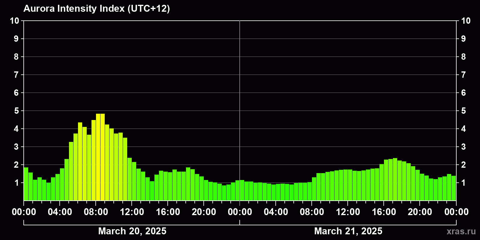 Changes in the auroral intensity index from 2025-03-20 to 2025-03-21 local time