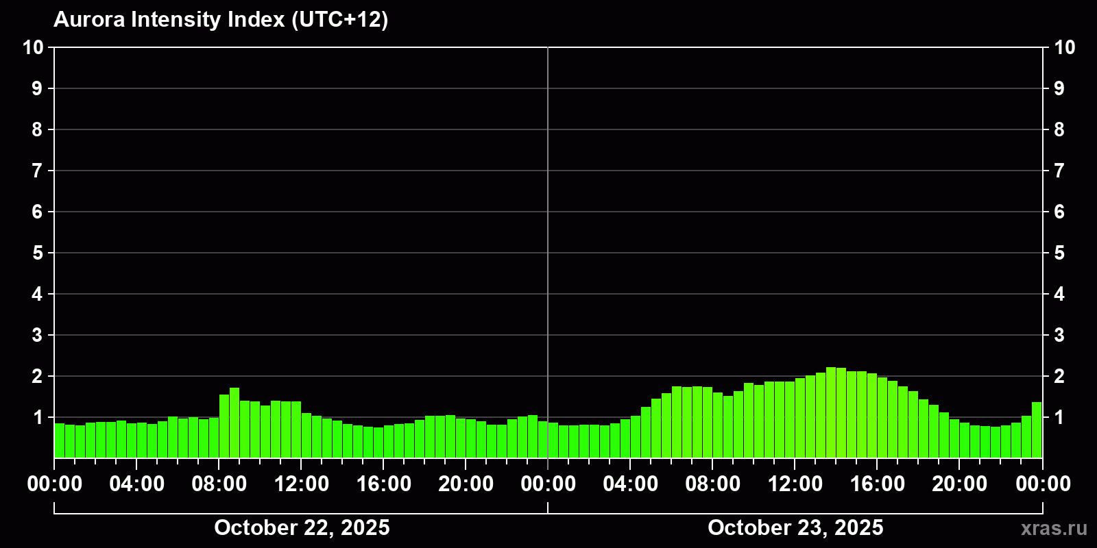 Changes in the auroral intensity index from 2025-10-23 to 2025-10-24 local time