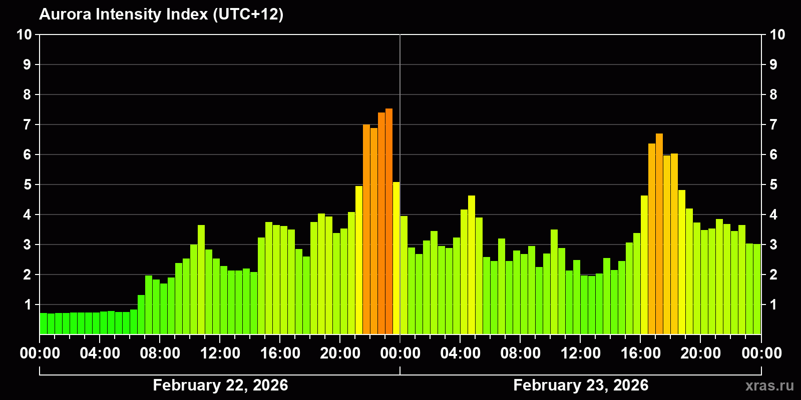 Changes in the auroral intensity index from 2026-02-22 to 2026-02-23 local time