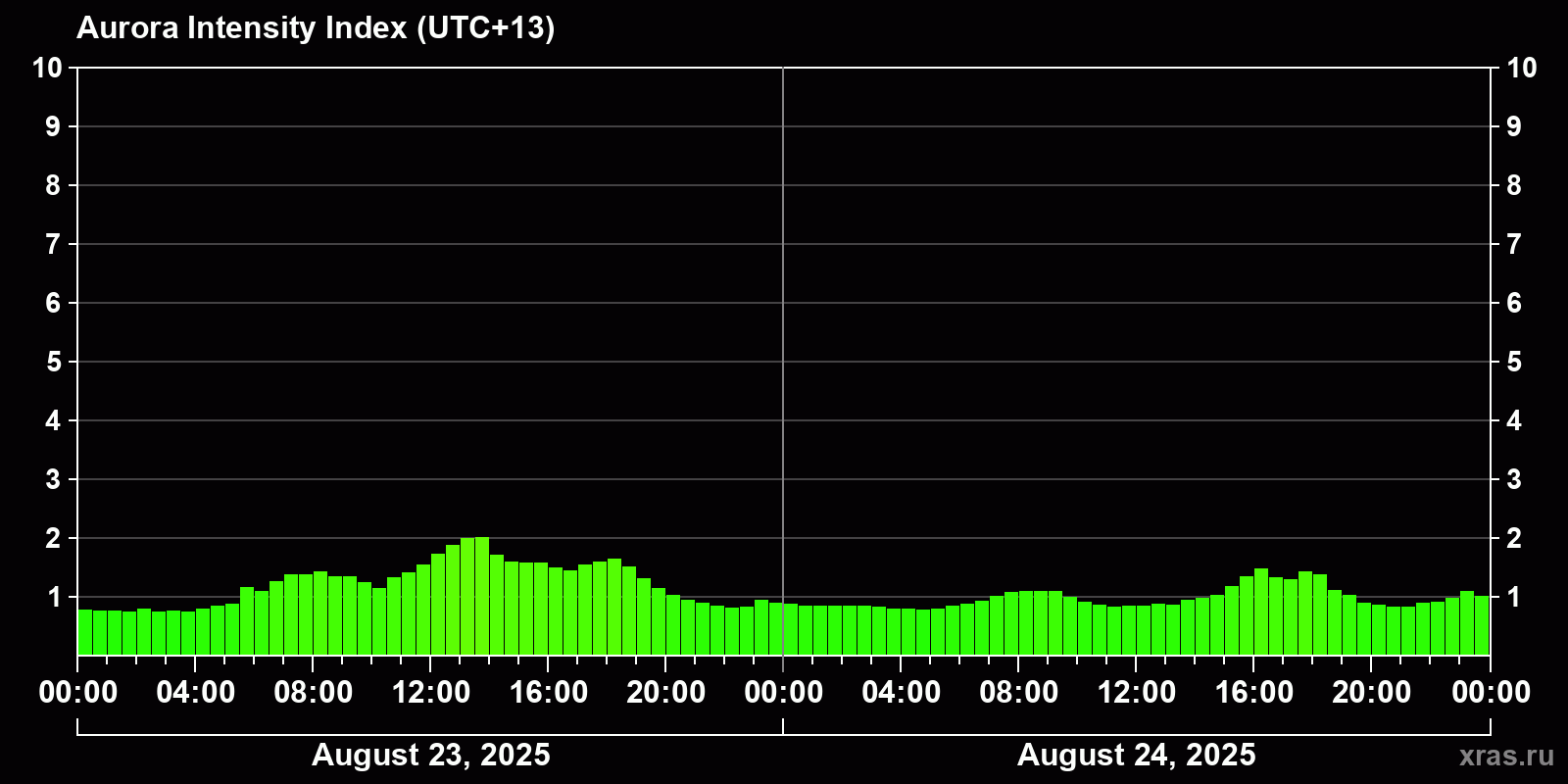 Changes in the auroral intensity index from 2025-08-23 to 2025-08-24 local time