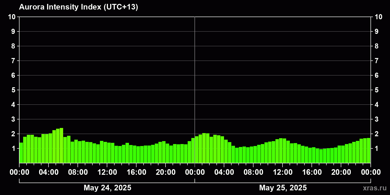 Changes in the auroral intensity index from 2025-05-25 to 2025-05-26 local time