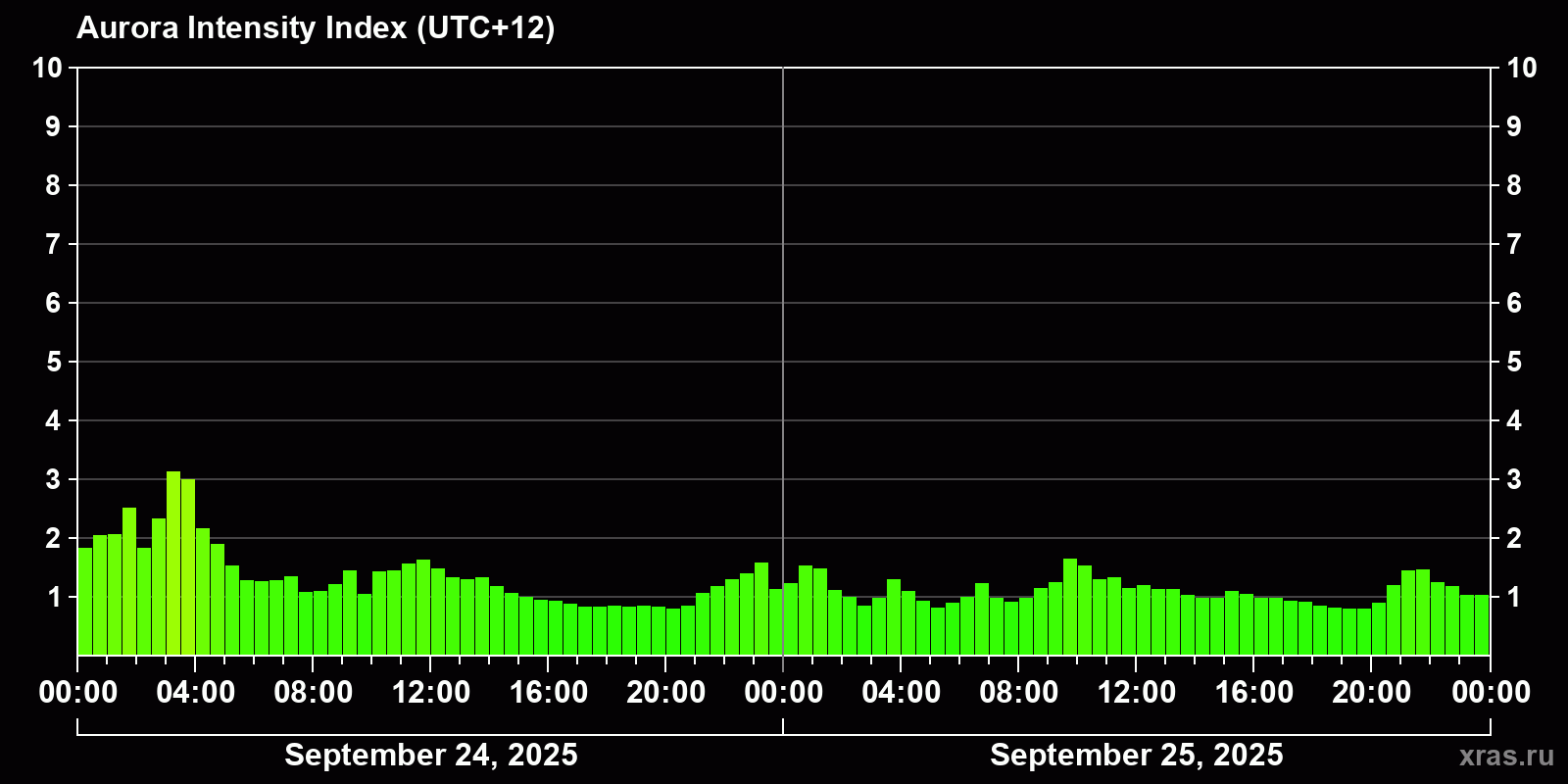 Changes in the auroral intensity index from 2025-09-25 to 2025-09-26 local time