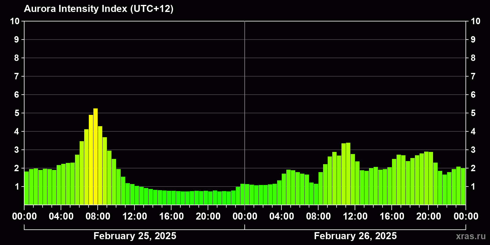 Changes in the auroral intensity index from 2025-02-25 to 2025-02-26 local time