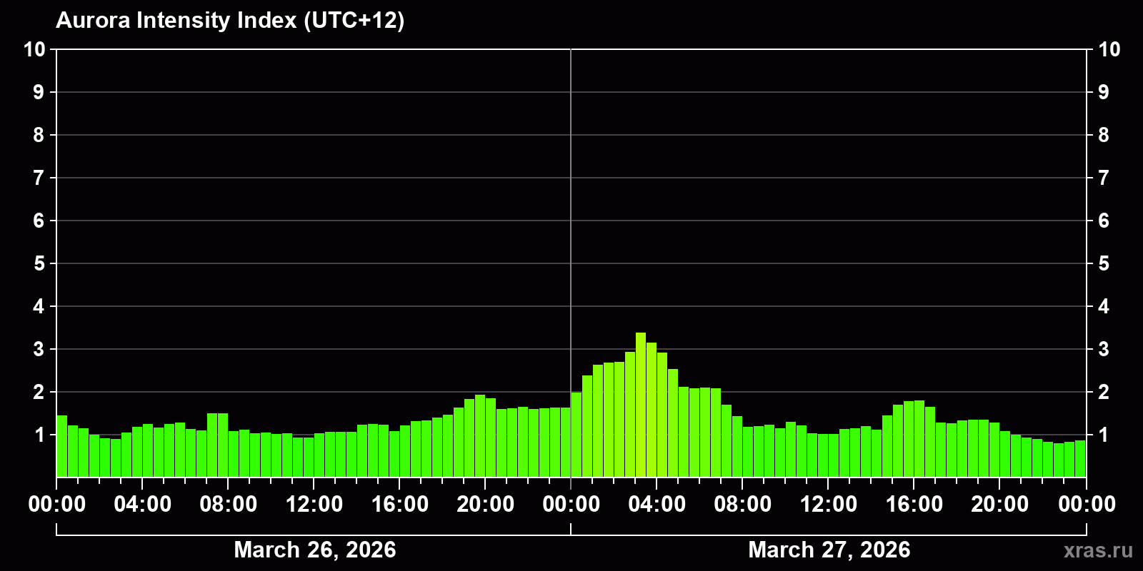Changes in the auroral intensity index from 2026-03-26 to 2026-03-27 local time