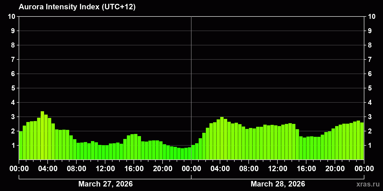 Changes in the auroral intensity index from 2026-03-27 to 2026-03-28 local time