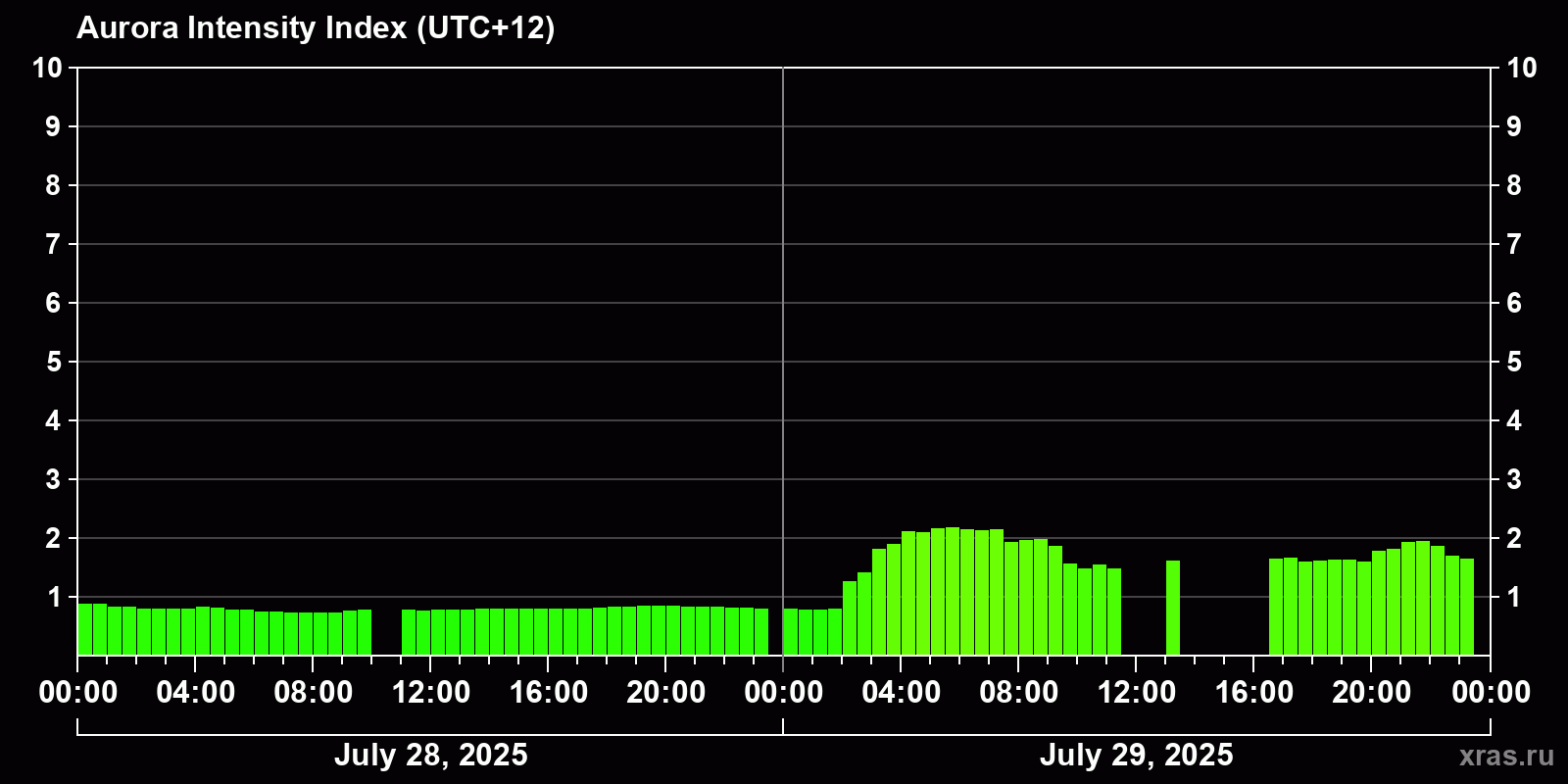 Changes in the auroral intensity index from 2025-07-29 to 2025-07-30 local time
