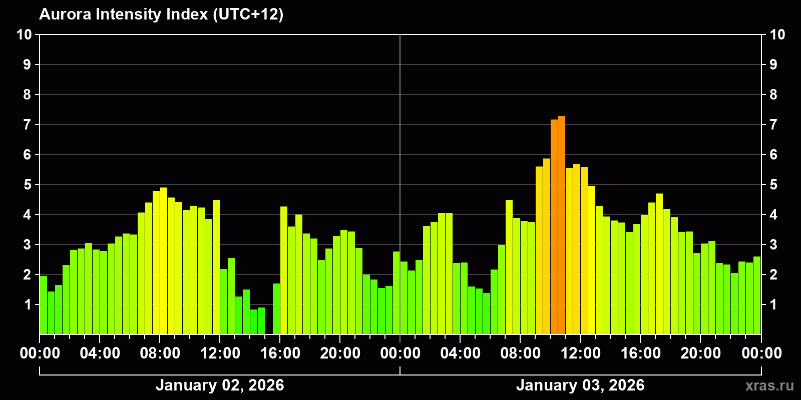 Changes in the auroral intensity index from 2026-01-02 to 2026-01-03 local time