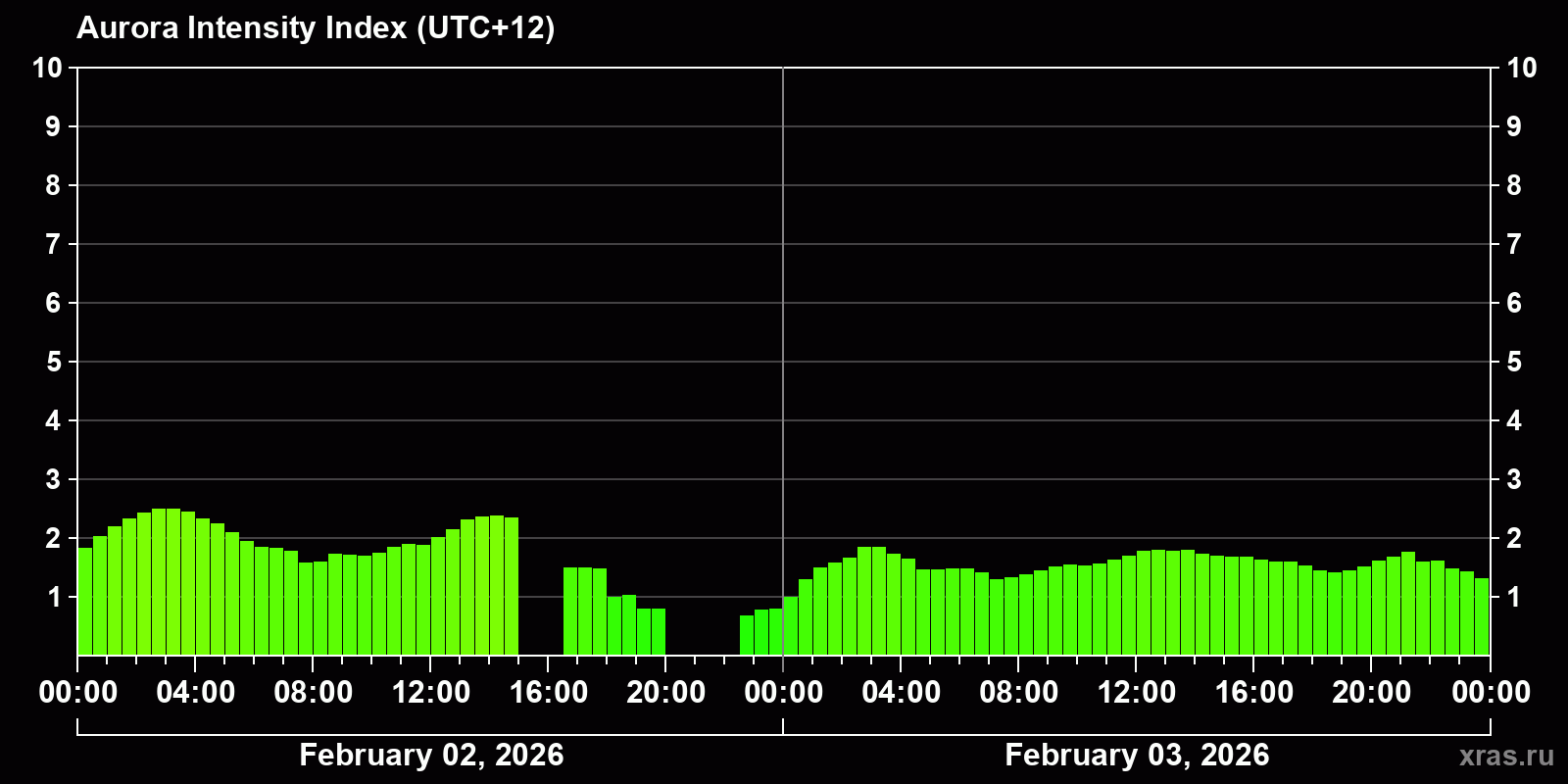Changes in the auroral intensity index from 2026-02-02 to 2026-02-03 local time