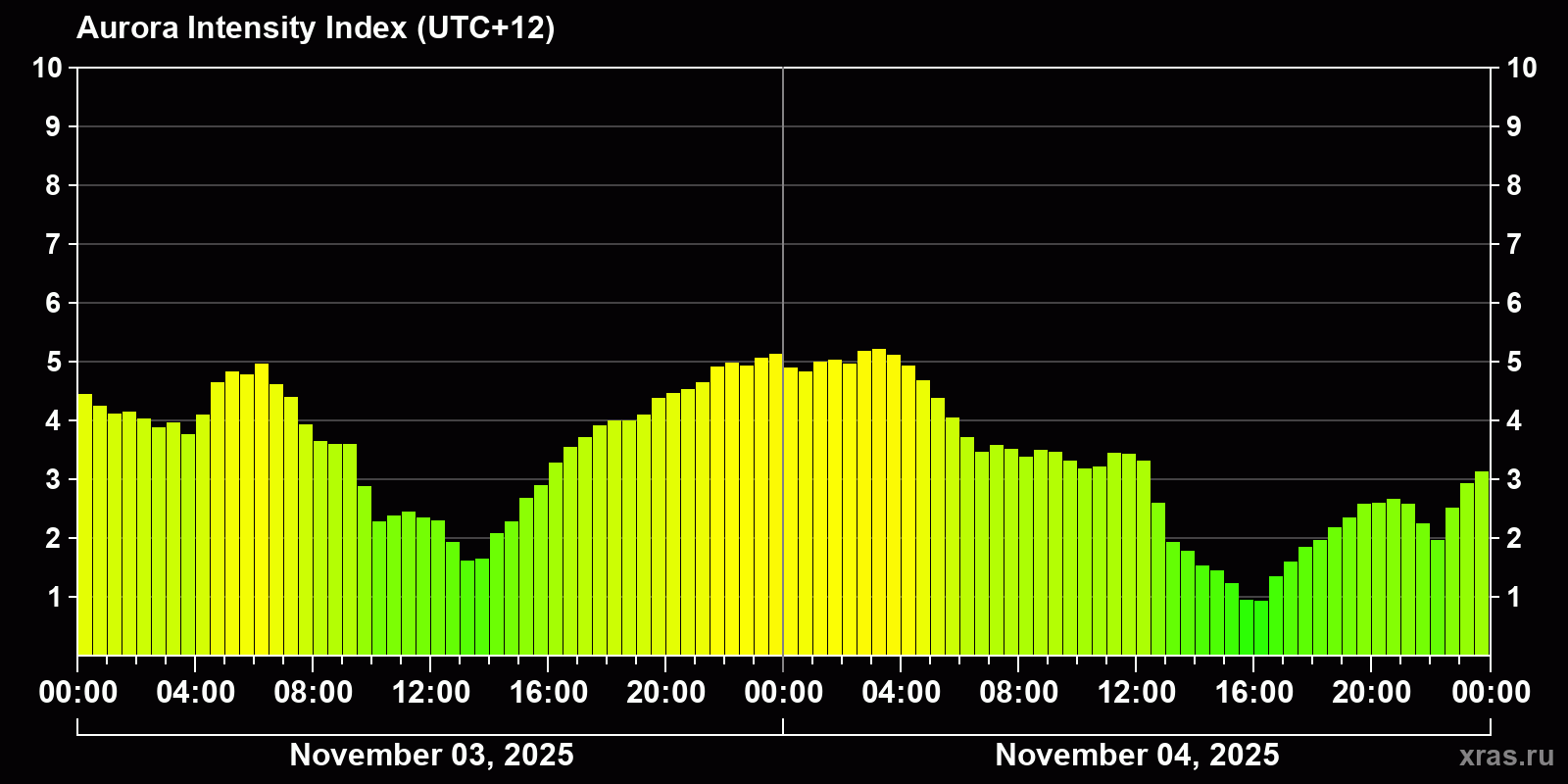 Changes in the auroral intensity index from 2025-11-03 to 2025-11-04 local time
