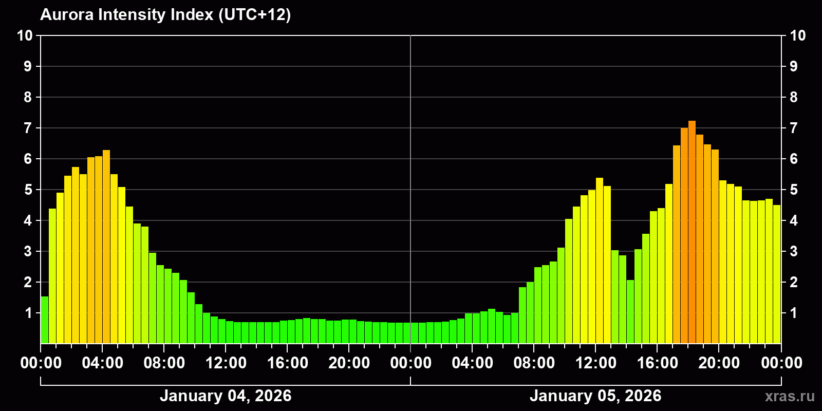 Changes in the auroral intensity index from 2026-01-04 to 2026-01-05 local time