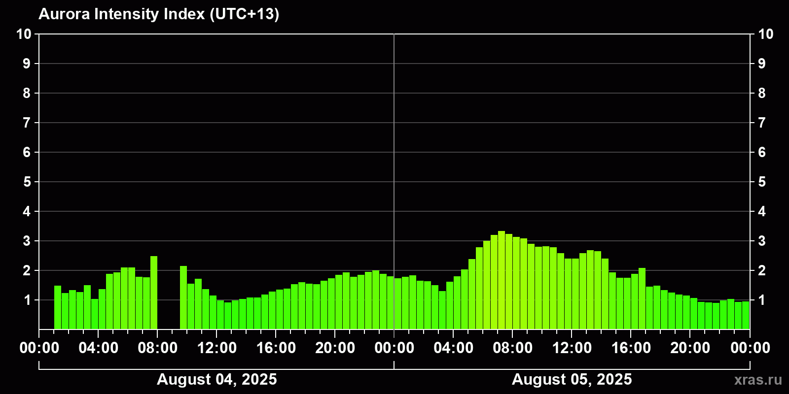 Changes in the auroral intensity index from 2025-08-04 to 2025-08-05 local time