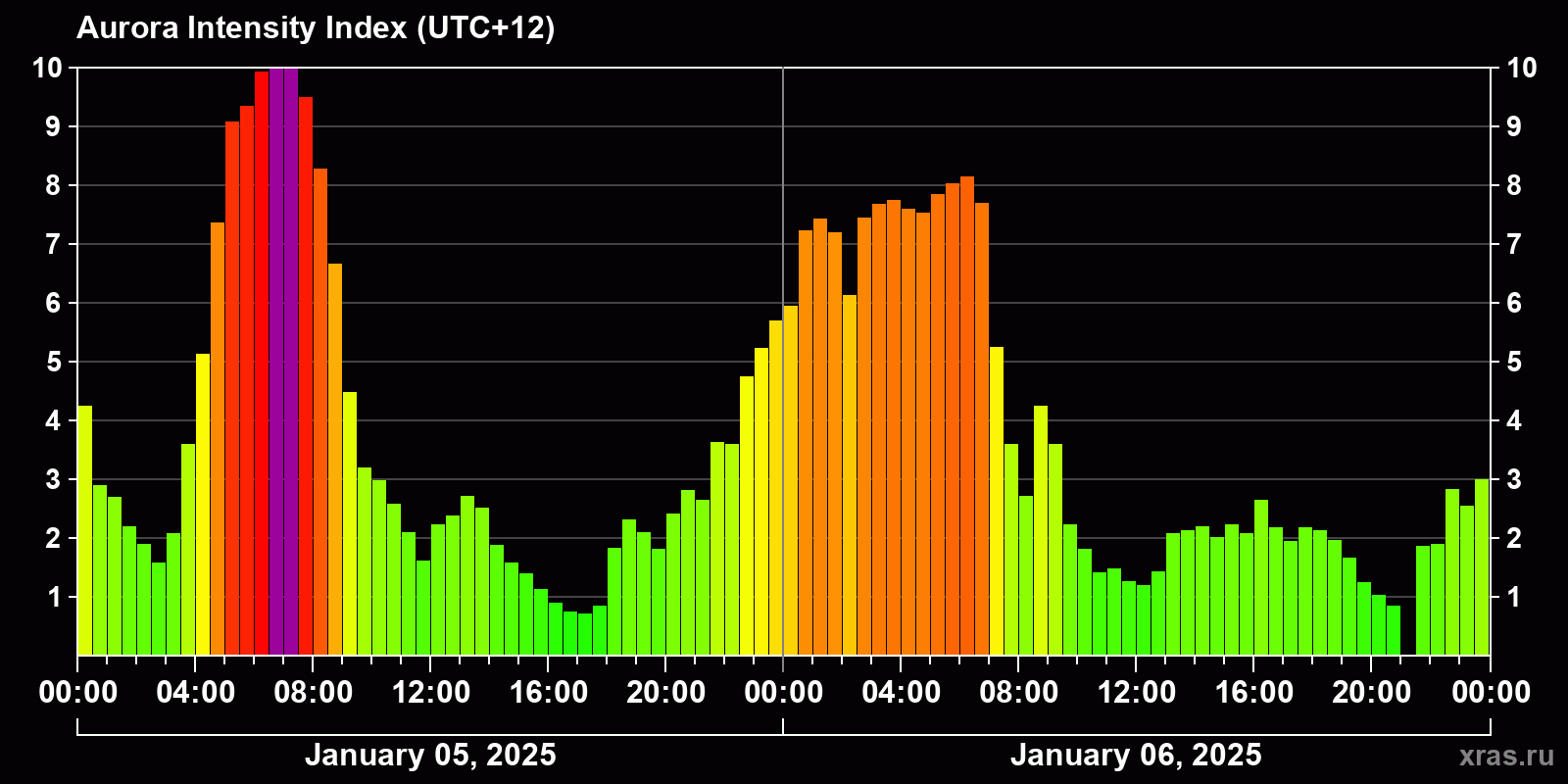 Changes in the auroral intensity index from 2025-01-05 to 2025-01-06 local time