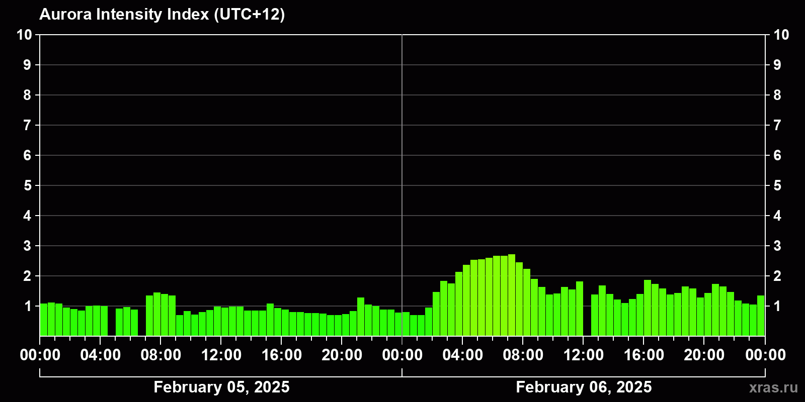 Changes in the auroral intensity index from 2025-02-05 to 2025-02-06 local time